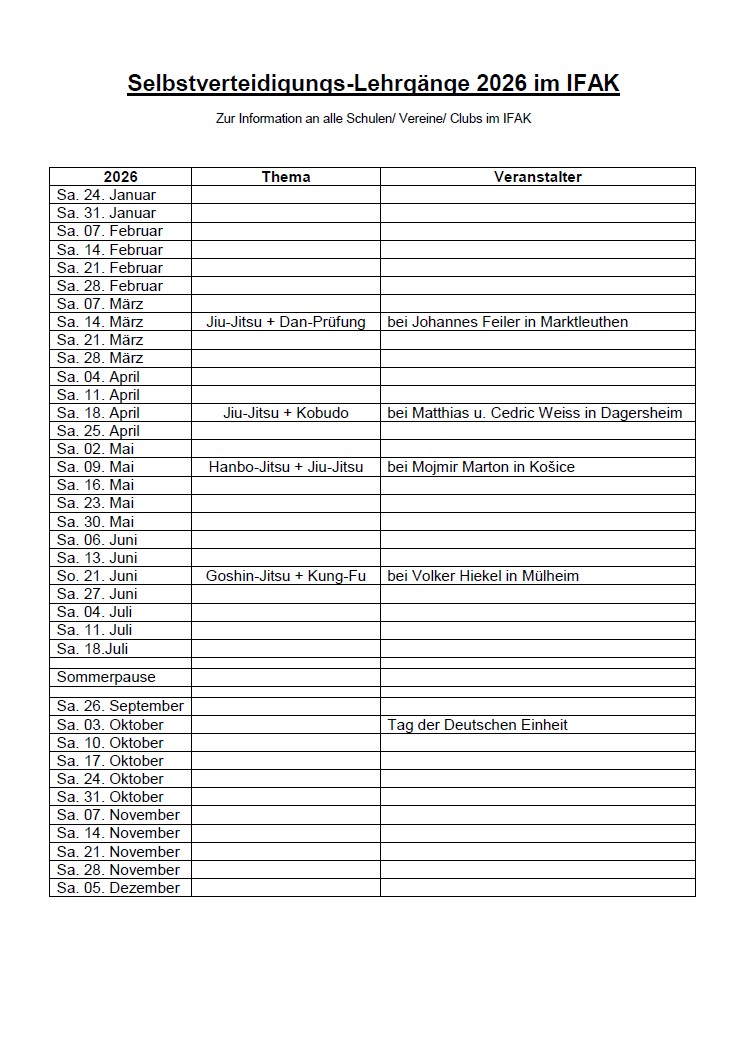 • 18.04.2026 Ju-Jitsu, Hanbo-Jitsu und Kobudo Seminar + Dan-Prüfung in Dagersheim mit Hanshi Matthias Weiss, Hanshi István Mézáros und Renshi Cedric Weiss ⇒ Zur Ausschreibung