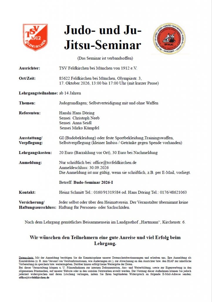 Lehrgänge Sa, 14. März 2026Jiu-Jitsu Seminar & Dan-Prüfungmit Hanshi Gregor Vogler, Sensei Jonas Vogler und Shihan Joe Feiler in Marktleuthen Sa, 28. März 2026Selbstverteidigungs-Lehrgangmit Uwe Rehnertin Kressbronnbei Uwe Gischas Sa, 18. April 2026Dagersheimer KampfsportlehrgangJu Jitsu, Hanbo Jitsu und Kobudo mit Prüfungsmöglichkeit mit Hanshi Matthias Weiss, Hanshi István Mészáros und Renshi Cedric Weiss Sa, 09. Mai 2026Ju Jitsu und Hanbo Jitsu Lehrgangmit Hanshi M. Weiss, Hanshi H. Döring, Hanshi I. Mészáros, Shihan M. Marton und Renshi C. Weissin Kosice/Slowakei So, 21. Juni 2026MülheimerKampfkunst-LehrgangGoshin-Jitsu & Kung-Fumit Hanshi Volker Hiekel Sa, 17. Oktober 2026Judo- und Ju-Jitsu-Seminarmit Hanshi Hans Döring in Feldkirchen bei München ⇒ Zur Lehrgangsübersicht 2026